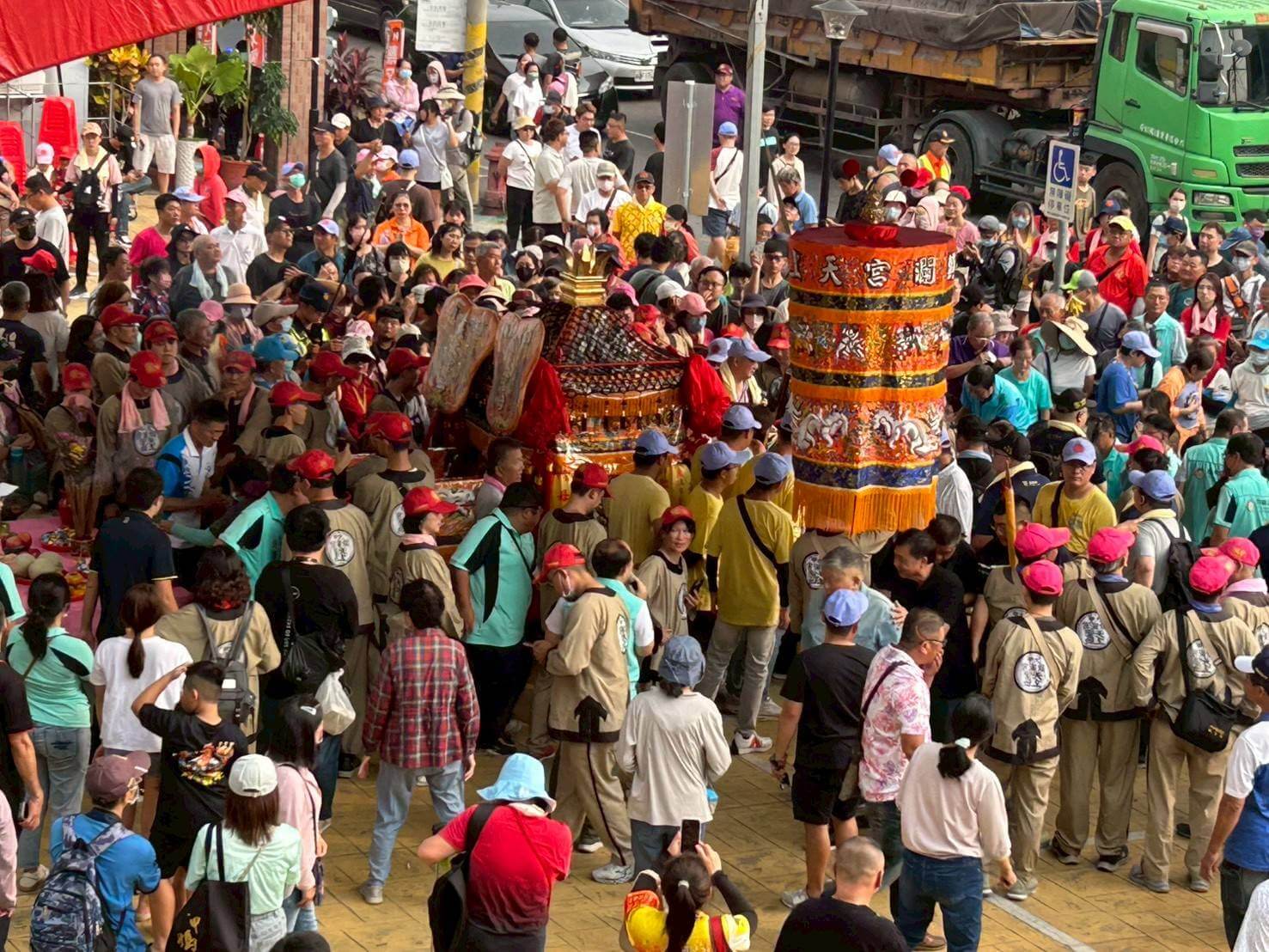 田中鎮公所於公所前廣場準備供品案桌,同仁們齊聚雙手合十齊心恭迎媽祖的到來。